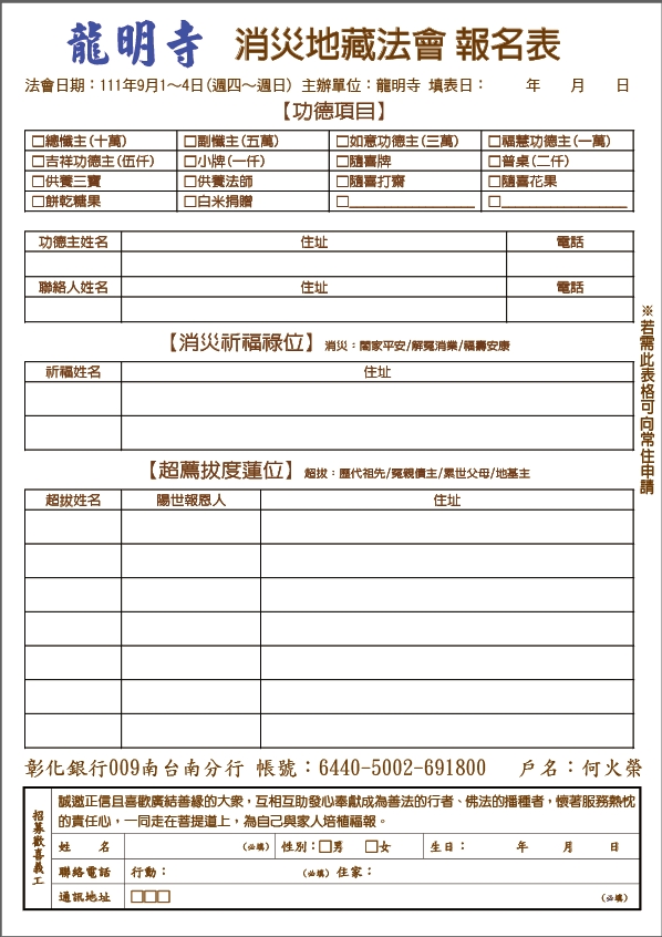 好消息!永康龍明寺2022年敬親孝月盂蘭盆法會預計於國曆2022年9月1日-9月4日(農曆八月六日-八月九日),敬請各界佛友,師兄師姐踴躍報名,參加法會,共霑法益!